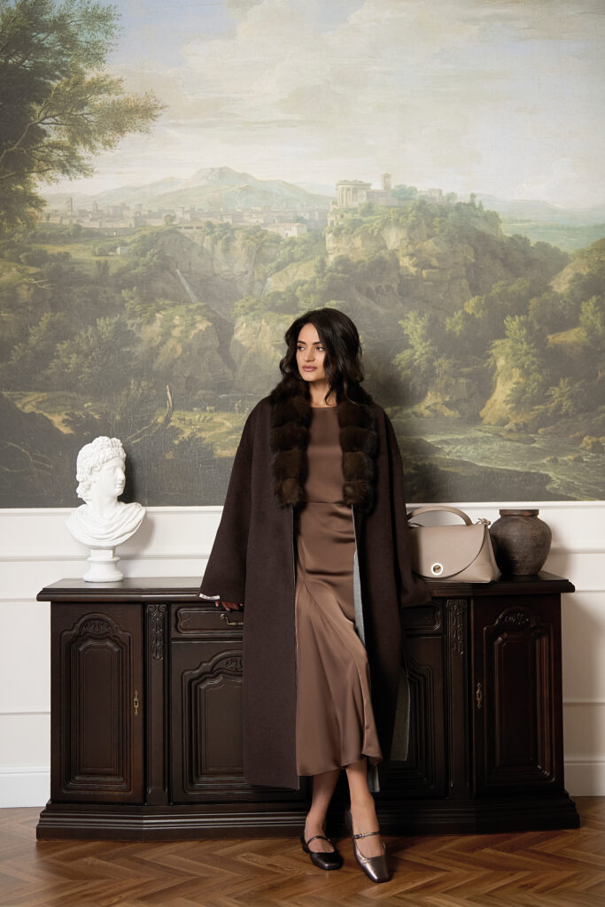 Кашемировое пальто с соболиным воротником и шелковое платье цвета кофе создают образ утончённой элегантности. Балетки Pollini и сумка Coccinelle добавляют шарм и комфорт.