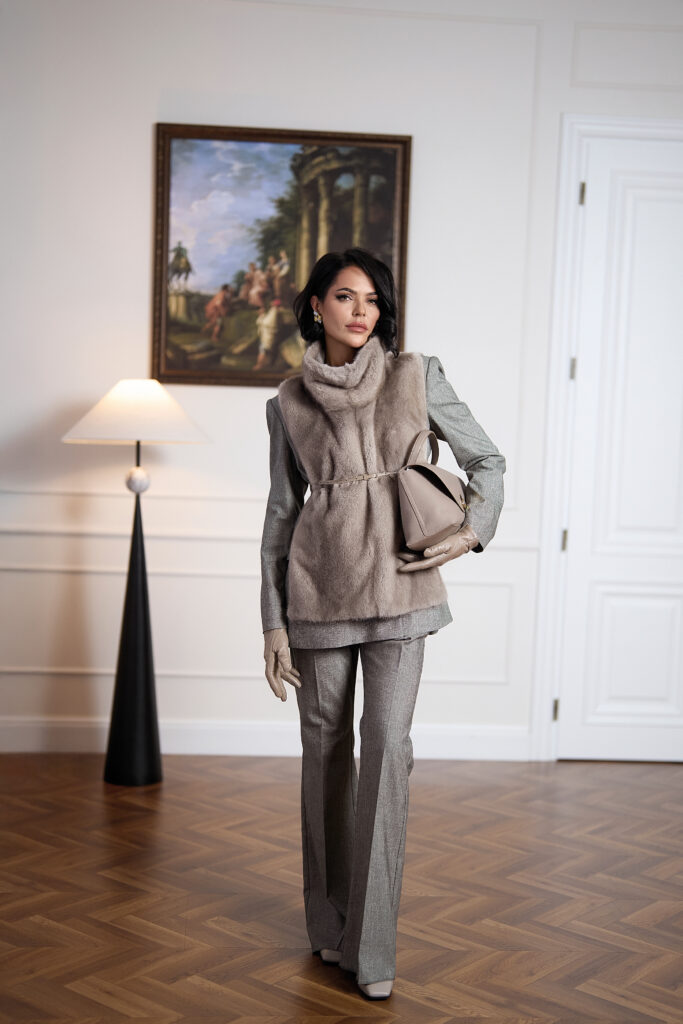 Норковая манишка добавляет изысканности серому костюму Penny Black из шерсти с люрексом. Перчатки и сумка в тон создают утончённый, современный осенний образ.