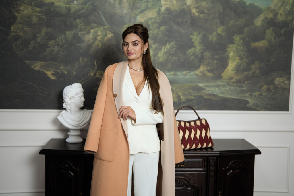 Элегантное пальто в тёплом оттенке подчёркивает утончённость образа. Мягкая фактура и изысканный крой придают ему благородный вид. Белый костюм от Pannyblack добавляет образу безупречный стиль и современный шик.