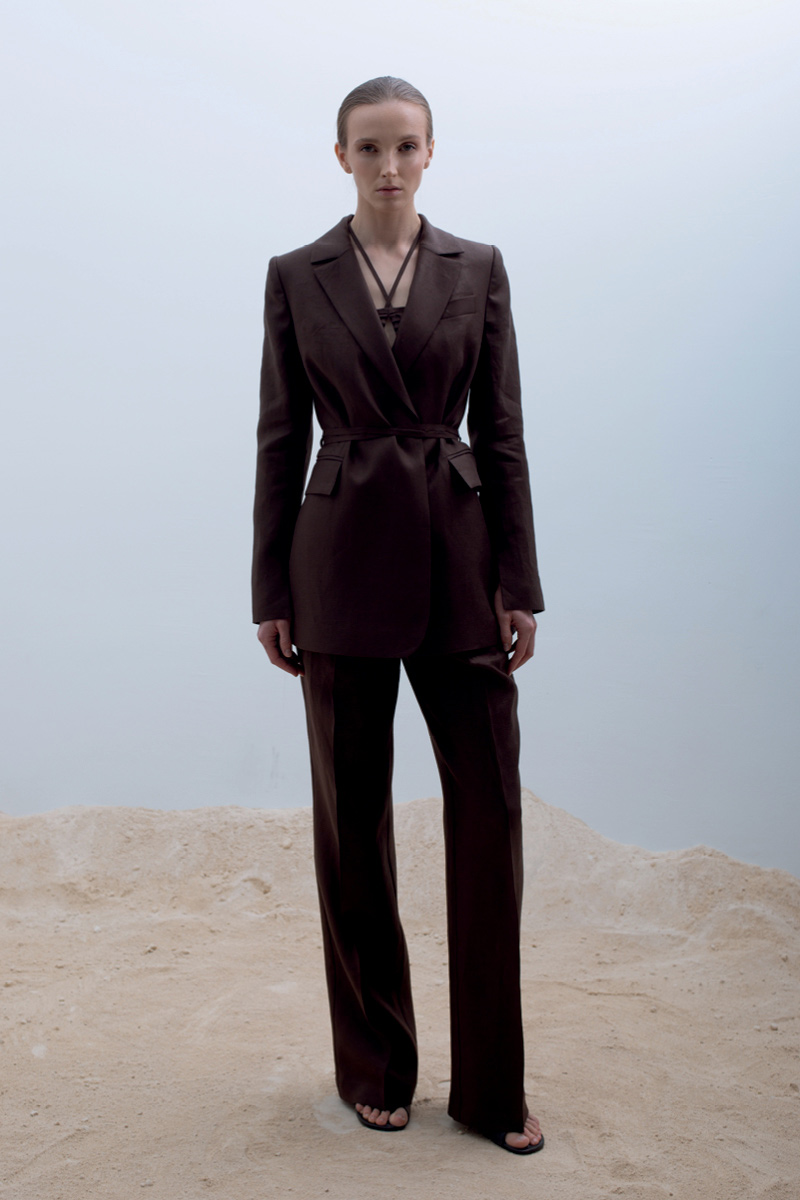 Коричневый костюм Katea Gri — BROWNIE oversized belted jacket with BROWNIE low waist wide-leg trousers.